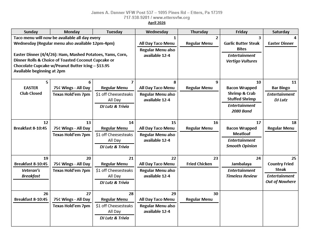 April 2026 Menu